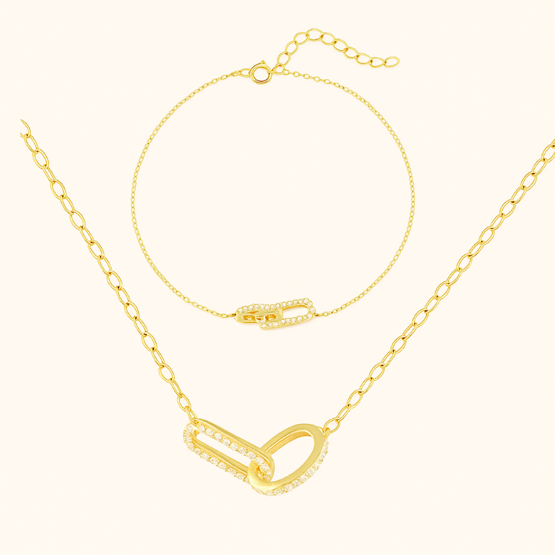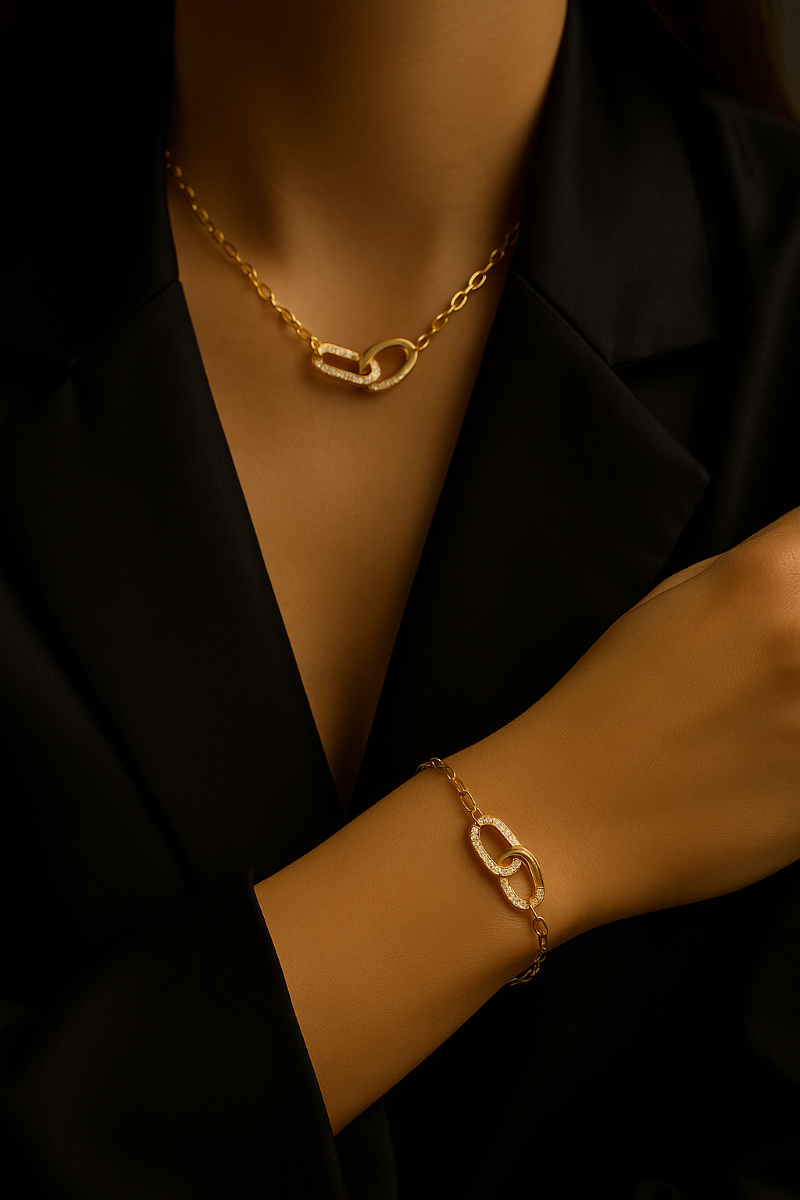 Elevate your elegance with the EternaLink Harmony Set™ — a stunning symbol of strength and connection. Crafted from genuine 925 sterling silver and plated with luminous 14K gold, this geometric double-buckle design embodies timeless sophistication.The bracelet’s dainty cable chain pairs beautifully with the necklace’s radiant centerpiece, both outlined in pavé-set cubic zirconia that shimmer under every light. Perfect for both casual days and evening soirées, this set brings effortless refinement to every outfit.