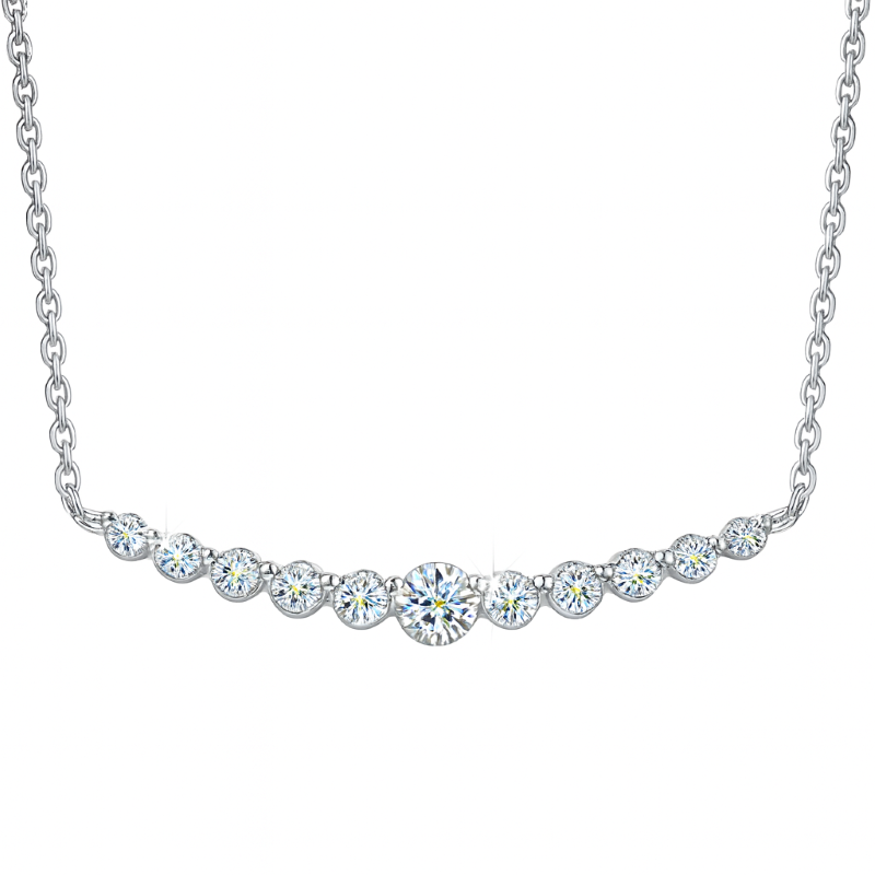 Meet the necklace that catches light from every angle. The Aurora Cascade™ features a graceful, graduated row of round moissanite gemstones set across a slim bar, suspended on a refined cable chain. Crafted in 925 sterling silver and finished with white-gold plating, it delivers long-lasting luster with the fire of moissanite.
