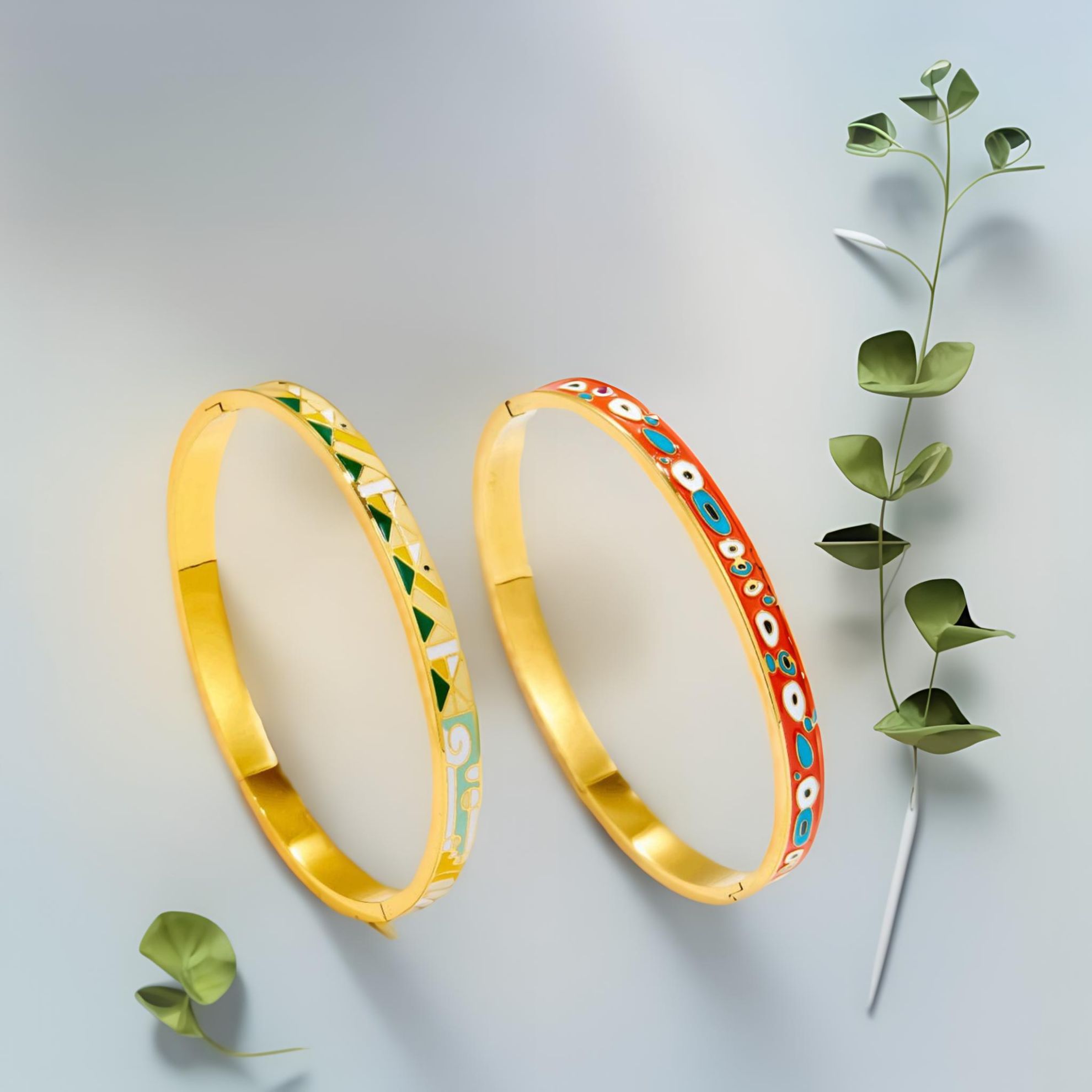 Vibrant enamel “eye” motifs meet a sleek, 18k gold-plated finish—stackable bangles that suit every wrist and every outfit. Lightweight at 11g, they bring a bold pop of color with a modern, talismanic vibe.