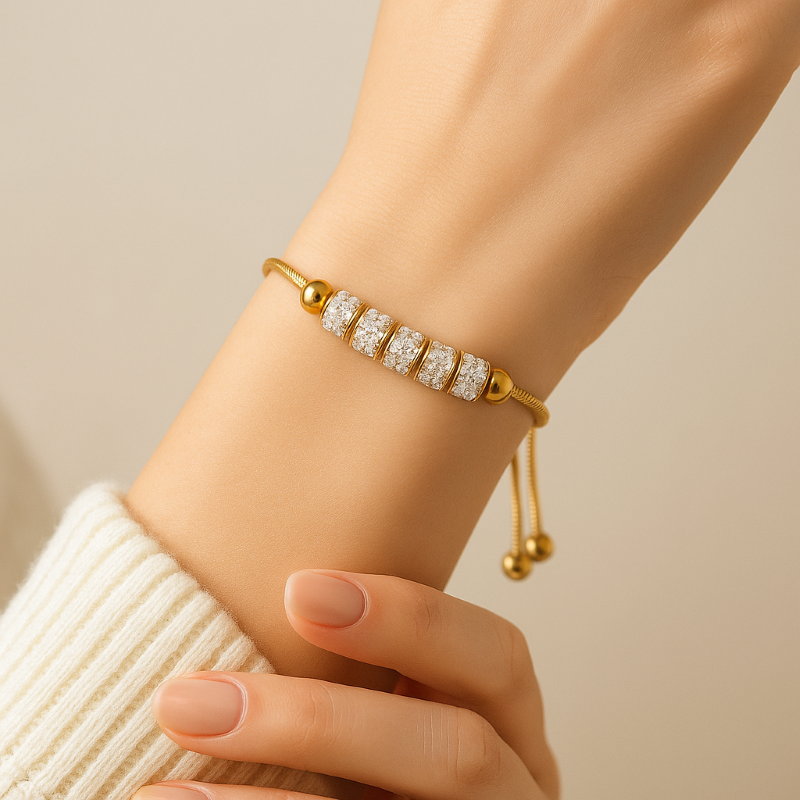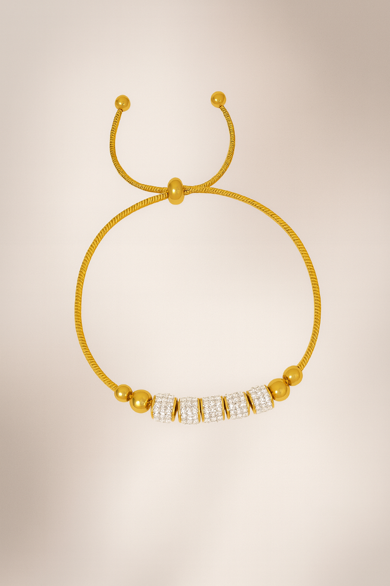 Meet the everyday statement that still feels effortless. The Nova Pavé Cube Slider Bracelet features a polished snake-chain cord accented with gleaming gold beads and a line of pavé-set cube spacers for high, multi-angle sparkle. The smooth slider closure lets you adjust the fit in seconds—snug for a refined stack or looser for a relaxed, solo shine. Lightweight yet eye-catching, Nova is the bracelet you’ll reach for from coffee runs to date nights.